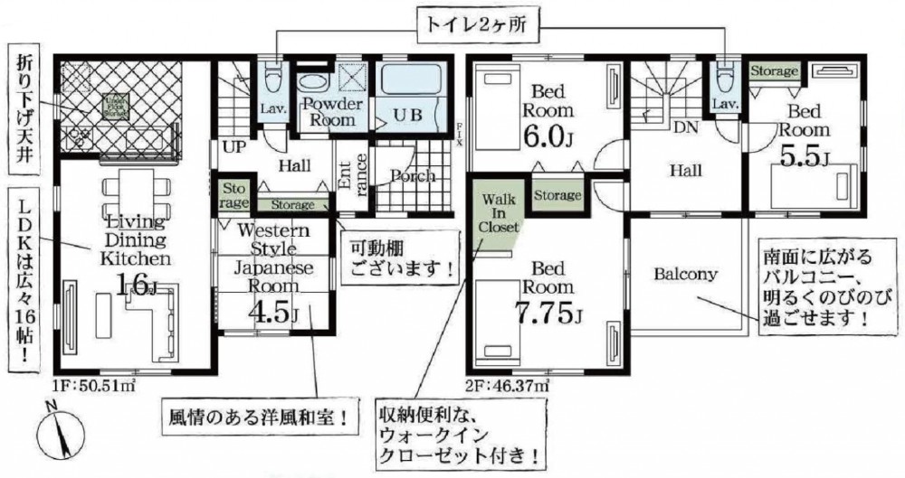 - システムキッチン、浴室乾燥機、モニタ付インターホン、追い焚き、床下収納、トイレ2箇所